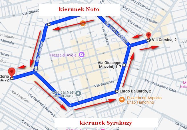 Uwaga, autobusy jeżdżą przez Avolę dwiema trasami, omijając ścisłe centrum. W kierunku Syrakuz jest to jedna trasa, w kierunku Noto – druga. Na mapce zaznaczyłam te trasy. Przy nich znajdują się przystanki w danym kierunku.