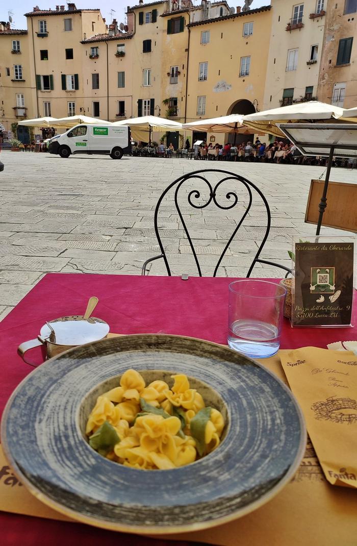 No i wreszcie jedzenie. Nie wiem, ile jest restauracji w Lukce, może ze 200? Ceny w wielu są umiarkowane, jest też restauracja z gwiazdką Michelin, gdzie menu degustacyjne kosztuje 110 euro. Ja nie jem mięsa, wszędzie prawie w restauracjach są dania – primi – bezmięsne, ale są i restauracje całkowicie wege. Chcę polecić dwa wegetariańskie miejsca, gdzie jadłem i było naprawdę smacznie. Jedno to Soup in Town na Piazza San Giusto, druga to Nanda’s Vegan Burger koło Piazza Napoleone – mają bardzo dużo różnych dań, nie tylko wegańskie burgery. Nanda’s położona jest w świetnym miejscu, troszkę obok i powyżej Piazza Napoleone, w bardzo ruchliwym, żywym miejscu, więc jedząc na dworze, oglądacie ten ruch trochę jak przedstawienie w teatrze.