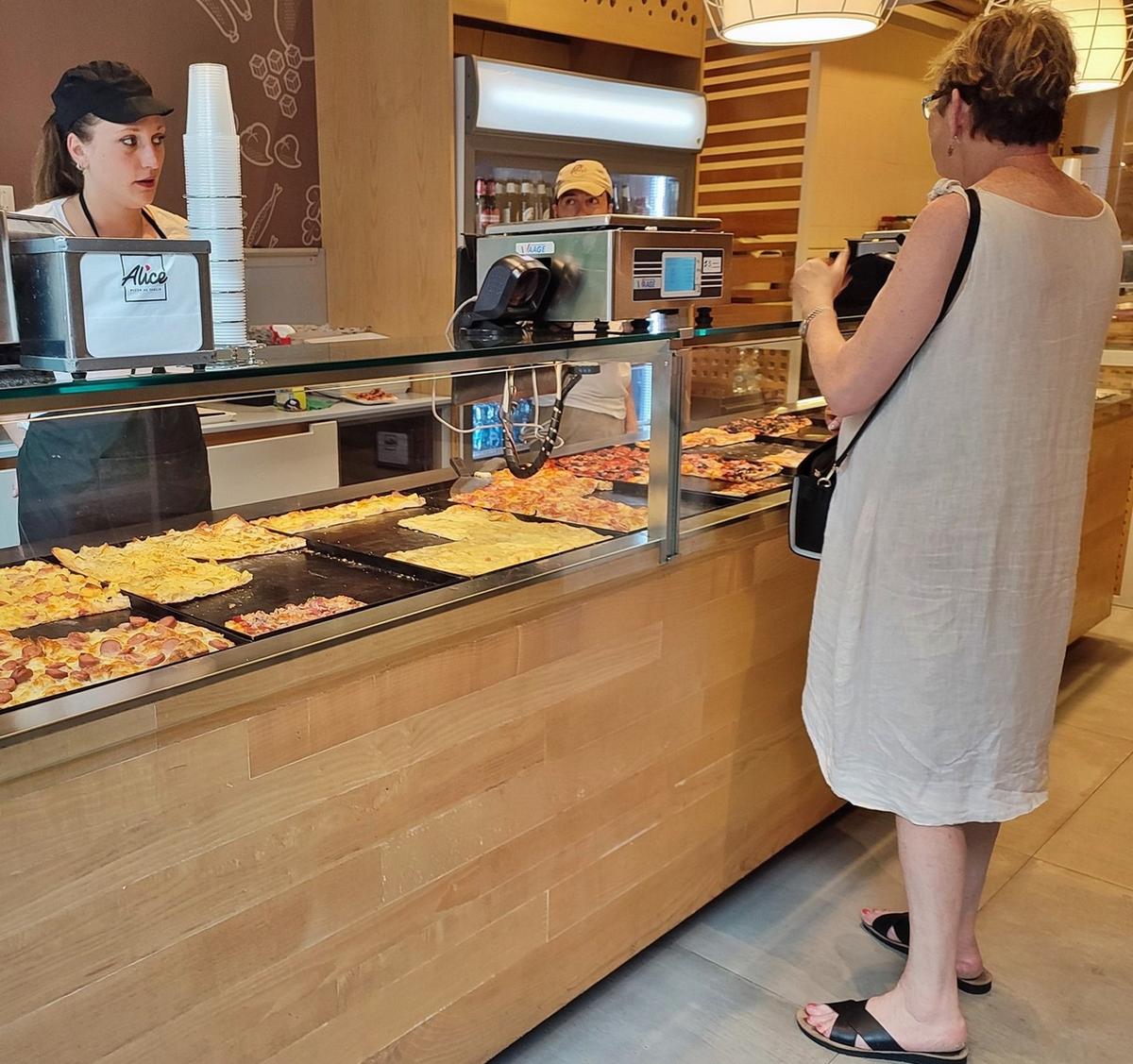 Byłbym zapomniał – pizza. Moje ulubione miejsce to Pizza Alice na Via S. Paolino 22, koło San Michele in Fioro. Specjalizuje się w pizzach na kawałki, a wielkość kawałka wy określacie. Rodzajów pizzy mają tam kilkadziesiąt, jak widzicie na zdjęciu ceny są bardzo umiarkowane, czekać nie trzeba, są stoliki na zewnątrz, no i pizza jest bardzo smaczna. W dodatku dostępna przez cały dzień, robiona na bieżąco, kiedy jakiś rodzaj pizzy się kończy.