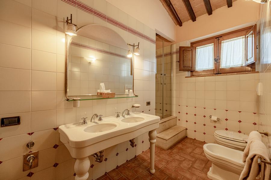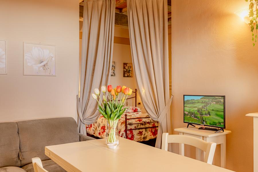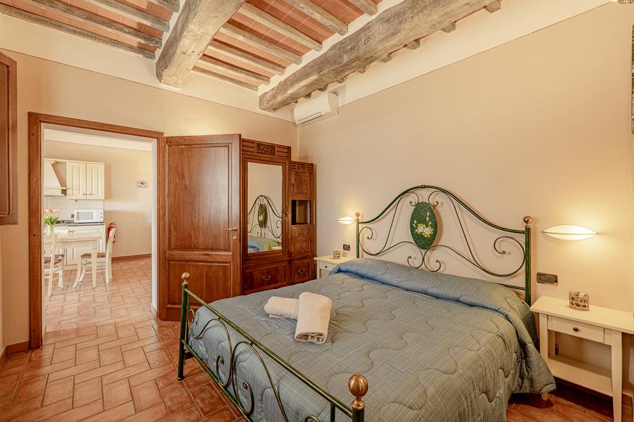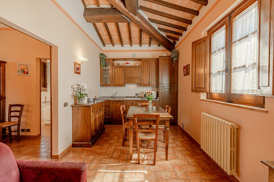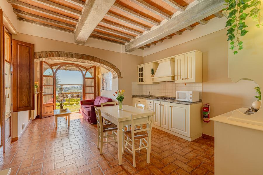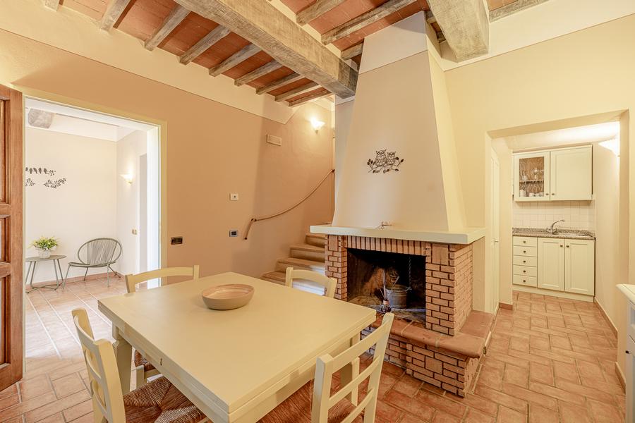 Mieszkania urządzone są w typowym stylu toskańskim, mają widoczne belki sufitowe, drewniane meble, terakotowe podłogi. To idealne miejsce na klasyczne wakacje w Toskanii!