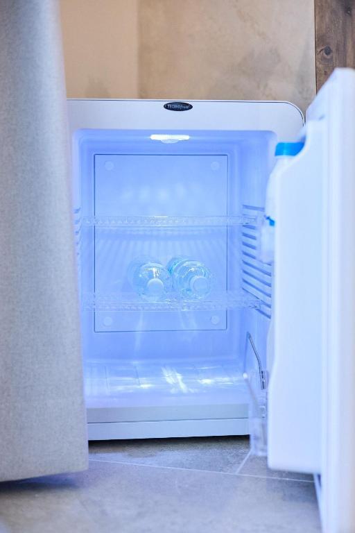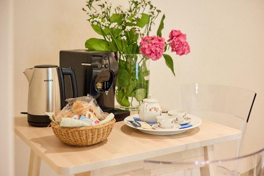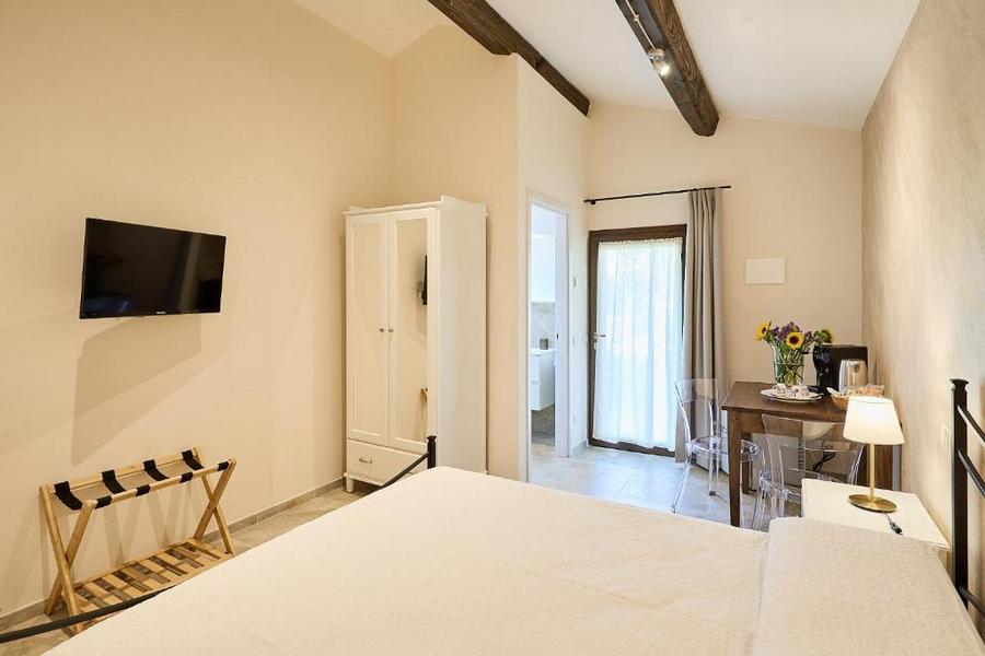 Pokój na parterze, z łóżkiem małżeńskim, prywatną łazienką z prysznicem. Na wyposażeniu jest mała lodówka, czajnik, ekspres do kawy, klimatyzacja. Na zewnątrz stolik z krzesłami.